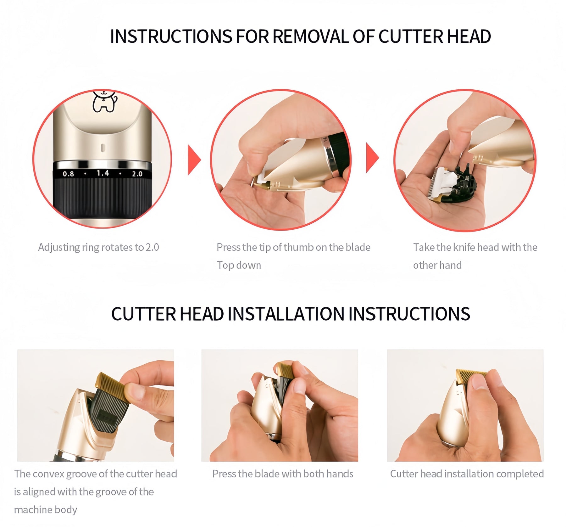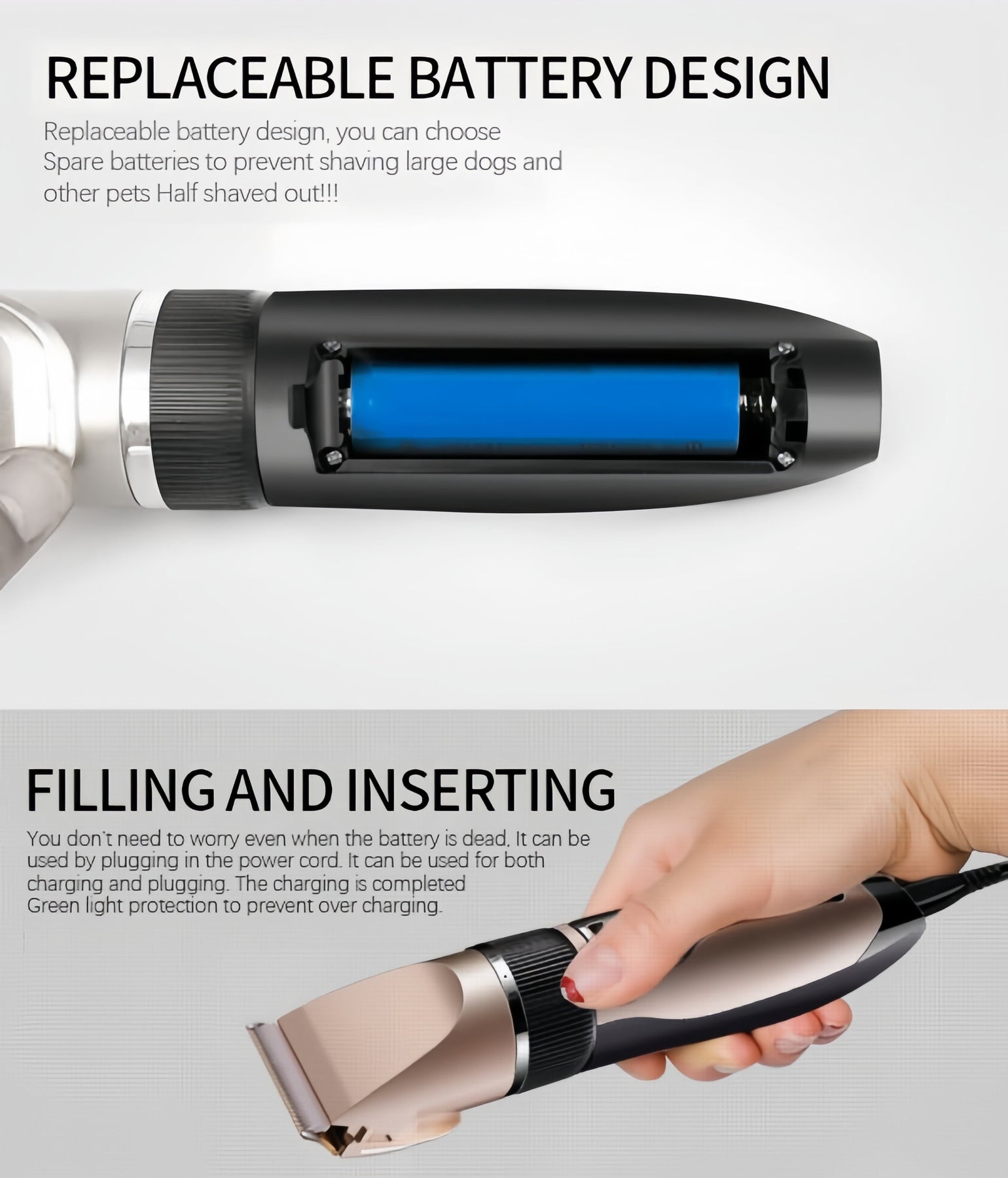 - Body Washable DesignReal washable, no need to take hassle removing the blade anymore.Long Running TimeCan use up to 180 minutes continuously.Ultra Quiet DesignWorking noise is less than 50dB, make your pets feel comfortable and not afraid of haircut any more.Double Sharp BladeThe blade is made of high-end stainless steel and ceramic, providing comfortable haircut for our lovely pets.Convenient Travel TakingA storage bag provided, convenient to store the clipping components and take for travel.Cordless and RechargeableRechargeable dog clippers with built-in battery. It can be used cordless and also used when charging.4 Steps to Do Pet Hair Grooming:1. Bathing your dog, keep it clean with no dirt;2. Grooming with a brush, remove the dirt and knots;3. Use scissor to cut the long hair shorter;4. Shave dog hairs dog clipper.