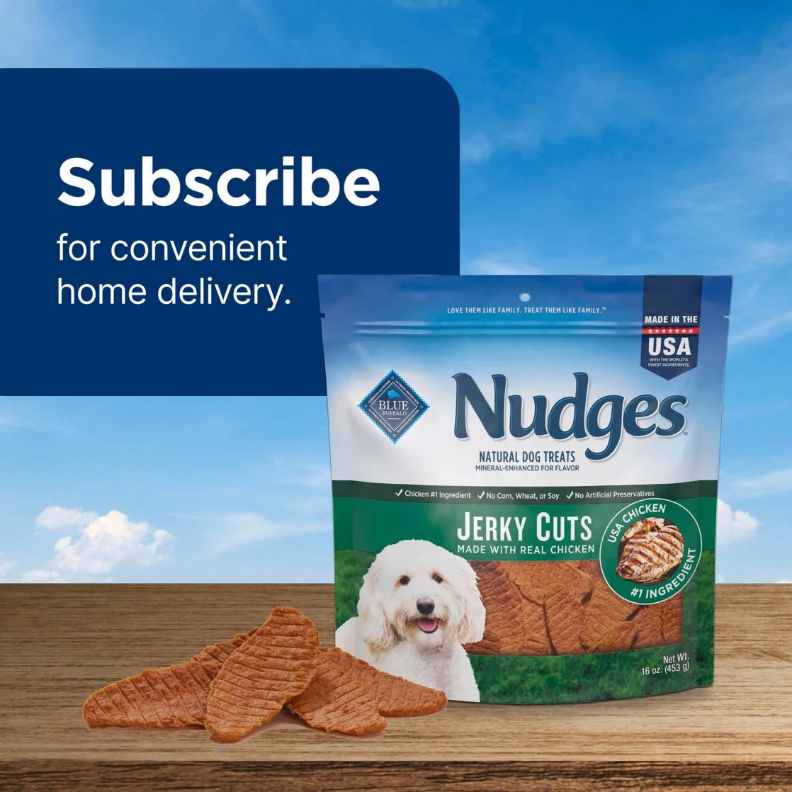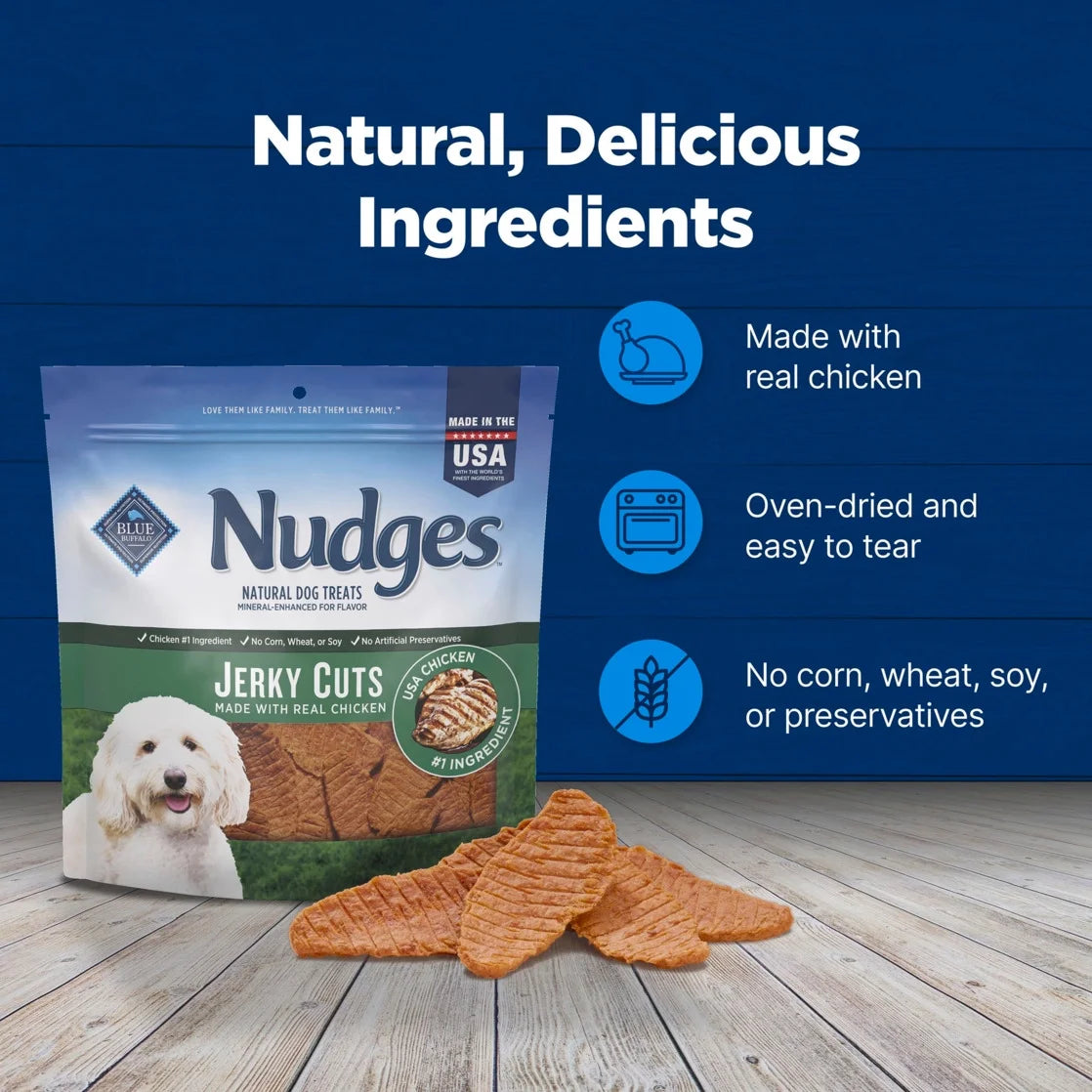 Reward your dog with real meat they can taste. BLUE Nudges® Jerky Cuts Dog Treats are made with real chicken as the first ingredient, gently oven-dried for a tender, tasty texture that’s easy to tear. Wholesome, all-natural ingredients make these jerky treats perfect for dogs of all sizes and ages.